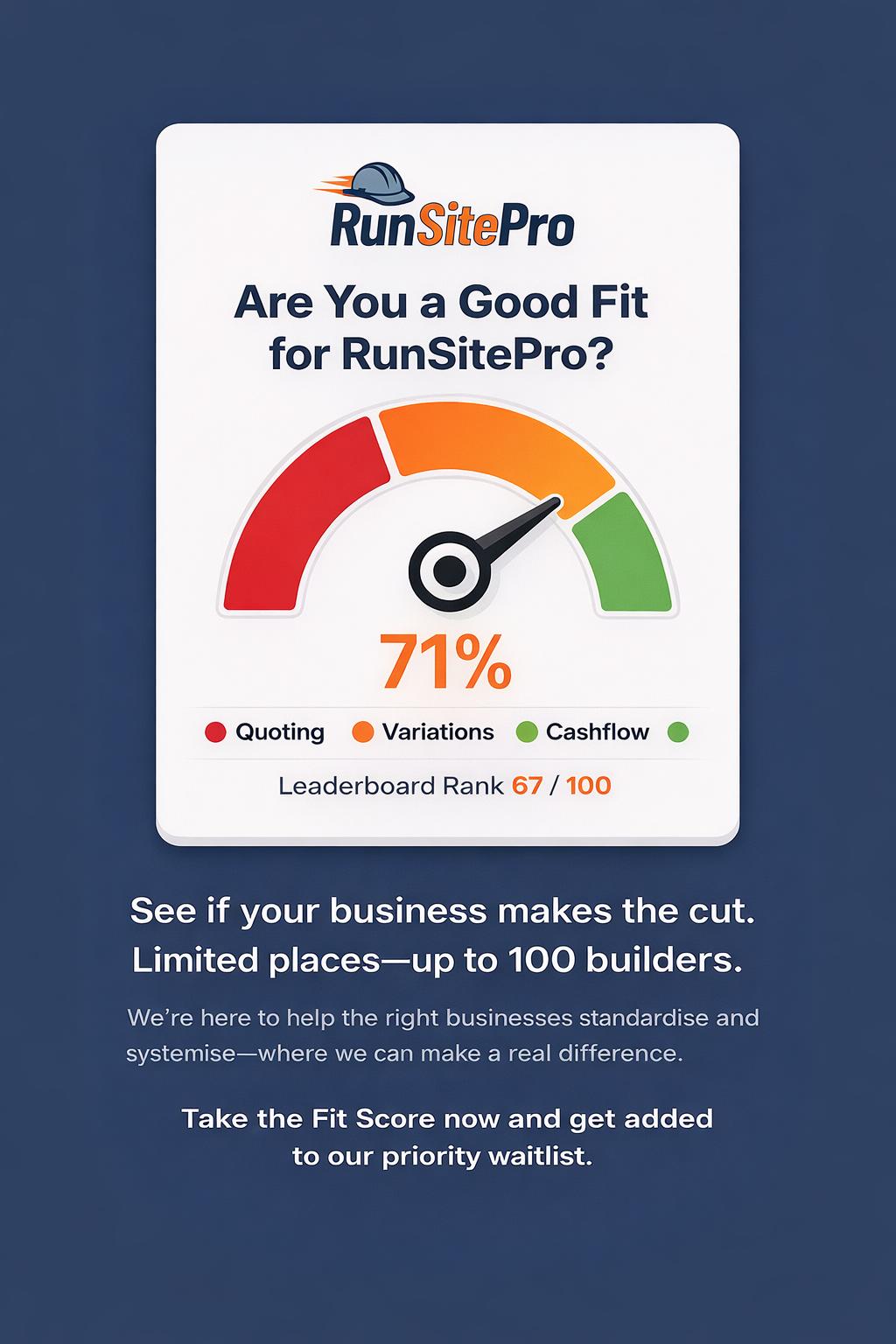 The RunSitePro Fit Score is a quick, no-nonsense assessment for owner-led building companies that are growing—and starting to feel the pressure of running everything without a proper system.